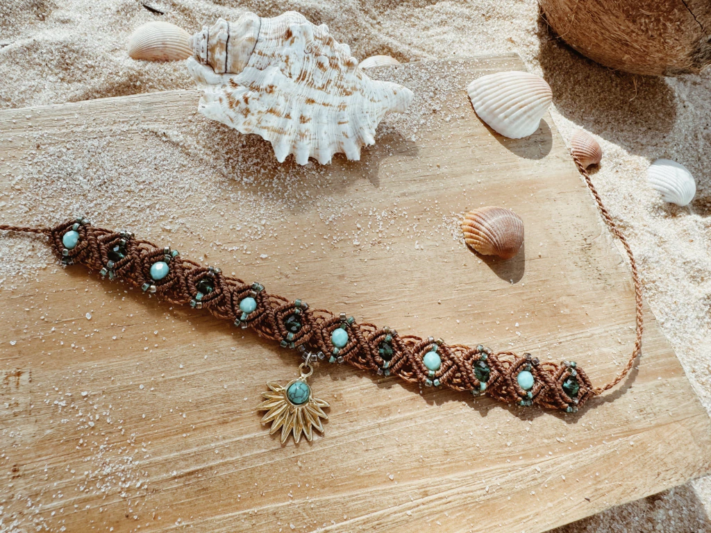 Discover the Sacred Leaf Necklace, a unique piece made of macramé that combines the beauty of natural stones, crystals and Murano glass. This accessory is not just a necklace, but a true manifestation of love for nature, evoking a mysticism that enchants.